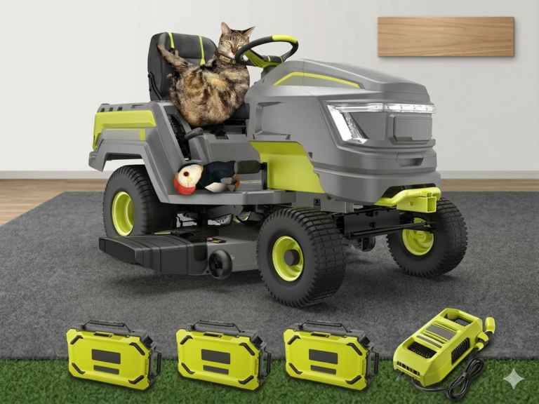 Tracteur-tondeuse 72 V + kit mulching + bac de ramassage + 3 batteries haute performance + chargeur + remorque